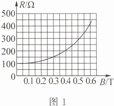 14. 物理学中常用磁感线来形象地描述磁场,用磁感应强度(用字母B表示)来描述磁场的强弱,它的国际单位是特斯拉(符号是T),磁感应强度B越大表明磁场越强;B=0表明没有磁场. 有一种电阻,它的大小随磁场强弱的变化而变化,这种电阻叫作磁敏电阻,如图1所示是某磁敏电阻R的阻值随磁感应强度B变化的图像. 为了研究该磁敏电阻R的性质,小刚设计了如图2所示的电路进行实验.