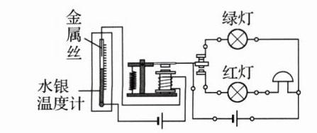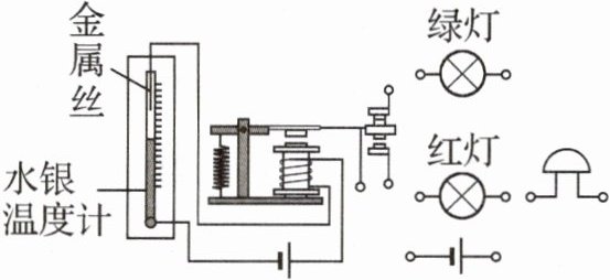 5. 新素养 科学思维 (2024·江苏常州一模)温度自动报警器的工作原理如图所示,在水银温度计的上方封入一段金属丝,当温度没有达到金属丝下端所指示的温度时,绿灯亮;当温度达到金属丝下端所指示的温度时,红灯亮,同时电铃响,此时电铃与红灯串联. 请根据以上要求,用笔画线代替导线,完成工作电路部分的连接.(要求导线不交叉)