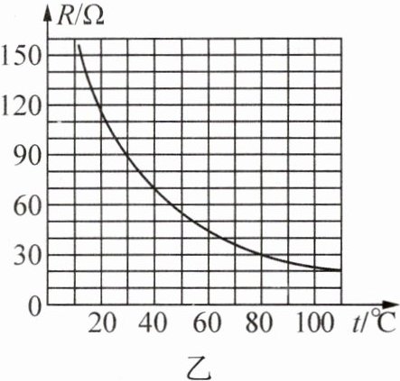 13. 新趋势 学科融合 小明利用热敏电阻设计了一个“过热自动报警电路”,如图甲所示. 将热敏电阻R安装在需要探测温度的地方,当环境温度正常时,继电器的衔铁与上触点接触,与下触点分离,指示灯亮;当环境温度超过某一值时,继电器的衔铁与下触点接触,与上触点分离,警铃响. 图甲中控制电路的电源电压U₁ = 4.5 V,电磁铁线圈的电阻R₀ = 20 Ω,当线圈中的电流大于或等于50 mA时,衔铁将被电磁铁向下吸合,警铃响. 如图乙所示是该热敏电阻的阻值随温度变化的图像.