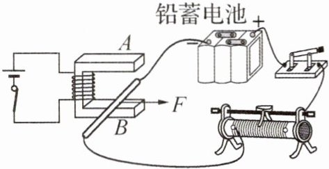 C@@解析:若只对调电磁铁的电源两极或只对调铅蓄电池的电源两极,即仅改变磁场方向或电流方向,导线在磁场中受力的方向会发生改变,故A、B错误;由图可知,电流从电磁铁上端流入、下端流出,由安培定则可知,电磁铁的A端为S极、B端为N极,在磁体的外部,磁感线从N极出发回到S极,所以电磁铁外部磁感线的方向是从B端出发回到A端,故C正确;电磁铁B端为N极,将一枚小磁针放在电磁铁B端旁,静止时,它的S极指向电磁铁B端,故D错误。