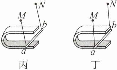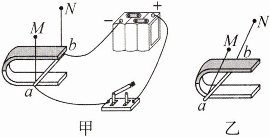 12.(2024·江苏南通期末)在观察“磁场对通电直导线的作用”活动中,小明用导线在固定的接线柱$MN$下悬挂一根较轻的金属棒$ab$,然后将其作为通电导线接入电路并放在蹄形磁体的磁场里,如图甲.
