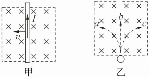 11. 通电导体在磁场中会受到磁场力作用,其本质是通电导体内的电荷做定向运动时受到磁场力的作用的宏观表现. 如图所示,虚线框内存在一磁场区,“×”表示磁场方向垂直纸面向里. 现有一通电导体,它在磁场中受力会运动,如图甲所示,其中“I”表示电流方向,“$v$”表示其受力方向,即运动方向. 在图乙中有一电子从磁场的下边界竖直向上飞入磁场,它进入磁场后可能会沿着________(选填“$a$”“$b$”或“$c$”)路径运动.