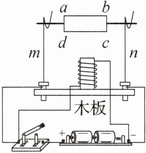 9. 新趋势 综合实践 如图,创新小组自制小小电动机:用硬金属丝制作两支架 m、n,固定在木板上;把一段粗漆包线绕成矩形线圈 abcd,漆包线的两端伸出作为引线,用小刀刮两端引线的漆皮,左端全部刮掉,右端只刮上半周或下半周,将引线放在支架上;用另一段漆包线绕在铁芯上制作电磁铁,置于线圈之下. 把线圈和电磁铁按图示接入电路,闭合开关,用手轻推一下,线圈就会不停地转下去.