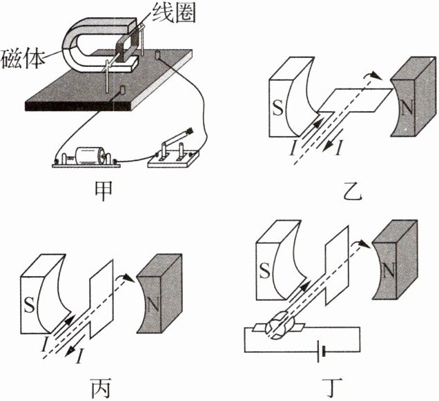 (2)在线圈转动过程中经过如图乙、丙所示两个位置,图 ________(选填“乙”或“丙”)中线圈恰好处于平衡位置,此时线圈由于 ________不会静止;另一个图中线圈左右两边所受的两个力不平衡的原因是这两个力 ____________. 如图丁所示的线圈可以持续转动,是因为它加装了换向器,能在线圈刚转过平衡位置时,自动改变 ________中的电流方向.