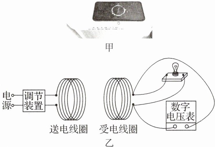 12. 新趋势 学科融合 无线充电器是利用电磁感应原理进行充电的设备,其过程为:在发送和接收端各安置一个线圈,送电线圈利用电流产生磁场,受电线圈利用磁场产生电流. 受电线圈正对并靠近送电线圈可以产生电流,使灯泡发光,实现电能的无线传输. 如图甲为手机通过上海地铁18号线列车的无线充电座进行充电,如图乙为“电能无线传输”的示意图.