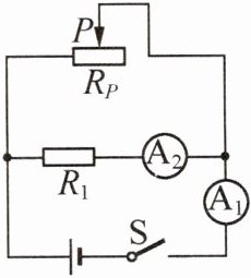 (1)10 V (2)50 Ω (3)11 W 解析:(1)由图可知,闭合开关S,R₁与Rₚ并联,电流表A₂测通过R₁的电流,则通过R₁的电流I₁ = 1 A,由欧姆定律可得,电源电压U = U₁ = I₁R₁ = 1 A×10 Ω = 10 V。(2)由图可知,电流表A₁测干路电流,则滑片P位于Rₚ中点时,干路电流I = 1.2 A,通过Rₚ的电流Iₚ = I - I₁ = 1.2 A - 1 A = 0.2 A,由欧姆定律可得,Rₚ接入电路的阻值Rₚ = U / Iₚ = 10 V / 0.2 A = 50 Ω。(3)当滑片P位于Rₚ的最右端时,Rₚ接入电路的阻值R'ₚ = 2Rₚ = 2×50 Ω = 100 Ω,此时通过Rₚ的电流I'ₚ = U / R'ₚ = 10 V / 100 Ω = 0.1 A,电路的总电流I' = I'ₚ + I₁ = 0.1 A + 1 A = 1.1 A,此时整个电路的电功率P = UI' = 10 V×1.1 A = 11 W。