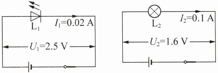 2. 将 LED 灯 L₁ 和小灯泡 L₂ 接入不同电路,测得它们的电压、电流如图所示,实验中 LED 灯比小灯泡亮得多. 下列说法正确的是 ( )