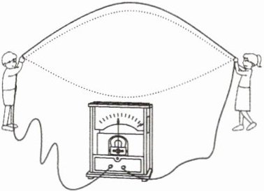 14. 物理老师课堂上组织大家做了有趣的“摇绳发电”实验.如图,他们将多股导线拧成了长约10米的跳绳,将跳绳的两端与固定在地面上的灵敏电流计相连,当图中摇绳的男女同学按________(选填“东西”“南北”或“任意”)方向站位摇绳时,灵敏电流计的指针左右摆动的幅度较大.本实验的原理是________现象,间接说明了地球周围存在________.