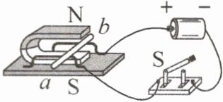 左@@不能@@磁场对电子束有力的作用 闭合开关,金属棒ab中的电流方向为从b到a,金属棒ab向右运动,只调换电源的正、负极,电流方向发生了变化,金属棒ab受力方向改变,即金属棒ab向左运动;有一束电子也沿从b到a的方向直线飞入磁场,若不考虑电子束的重力,由于磁场对电子束有力的作用,电子束不能沿直线穿过磁场。