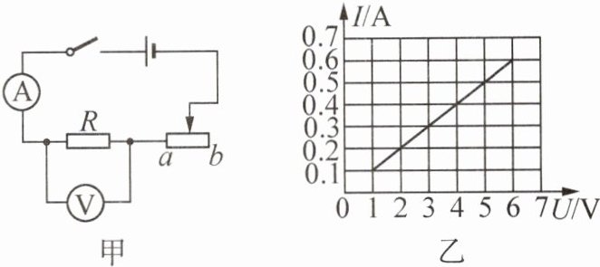 6@@10@@一直增大@@解析:由图甲可知,电阻R与滑动变阻器串联,电压表测R两端的电压,电流表测电路中的电流。滑片在a端时,滑动变阻器接入电路的阻值为零,电路为R的简单电路,此时电压表示数最大为电源电压,由图乙可知,电源电压U总 = U max = 6 V;电阻R的阻值R = U max / I max = 6 V / 0.6 A = 10 Ω。滑片由b端向a端移动的过程中,电路的总电阻一直减小,电源电压不变,由P = U² / R可知,电路消耗的总功率一直增大。