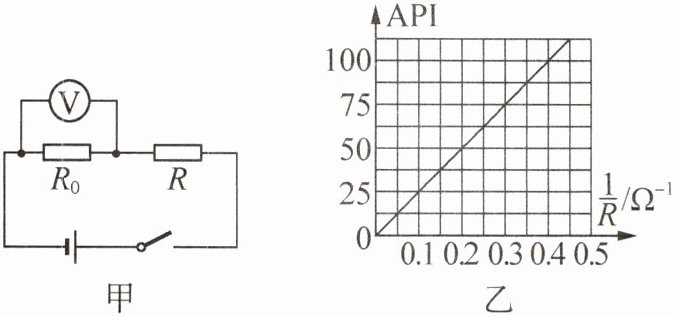 12. 新趋势 学科融合 空气污染指数(API)是一种反映和评价空气质量的方法,便于直观地表征空气质量和空气污染的程度. 某兴趣小组为了检测空气污染指数,设计了如图甲所示的检测电路,R 为气敏电阻. 空气污染指数与气敏电阻 R 的倒数的关系图像如图乙所示,已知电源电压为 9 V 不变,定值电阻 R₀=5 Ω. 求: