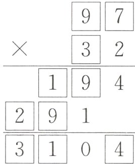 +思路分析 第一个竖式中,由第一个乘数的个位与2相乘的积的末尾是4可知,第一个乘数的个位是2或7,又由第一个乘数的个位与第二个乘数的十位相乘的积的末尾是1可知,第一个乘数的个位只能为7,且第二个乘数为32。再根据两个中间积与最终积的关系可知,4的左面必为9,则第一个乘数为97。