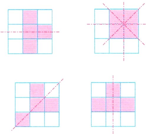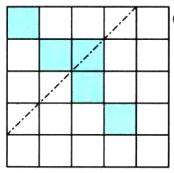 +跟踪练习3 新素养 几何直观 在下图中,增加一个小正方形(涂色表示),使增加后的整个涂色部分变成一个轴对称图形,并画出对称轴。