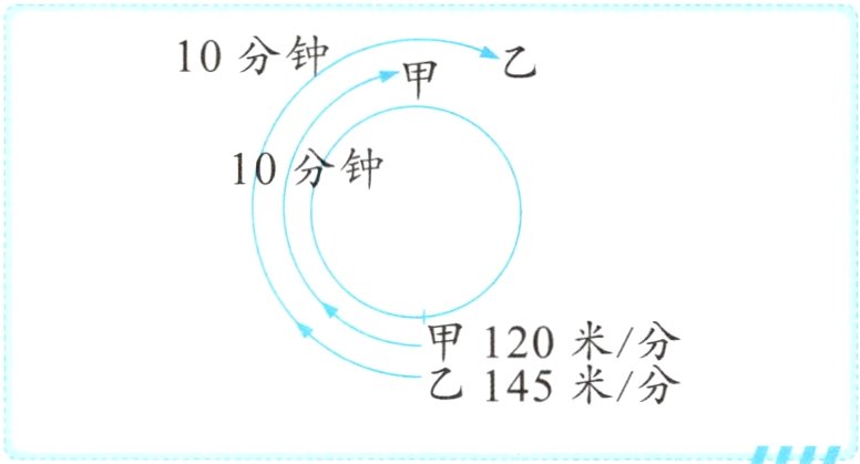 例 甲、乙两人沿2500米长的湖边环形跑道竞走,两人同时从同一地点向相同方向出发,甲每分钟走120米,乙每分钟走145米。10分钟后两人相距多少米?