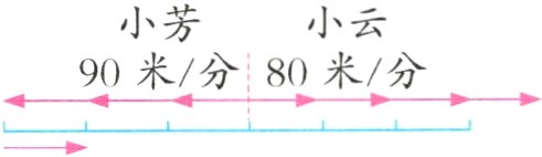 例1 小芳每分钟行90米,小云每分钟行80米。两人从同一地点同时出发,相背而行,3分钟后小芳转头去追小云,再经过多少分钟小芳能追上小云?