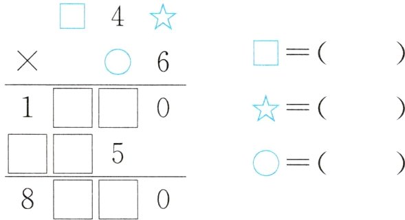 $\begin{array}{r}\square4☆\\\times\ \ \ \ \ \ \ ○6\\\hline1\square\square0\\\square\square5\\\hline8\square\square0\end{array}$