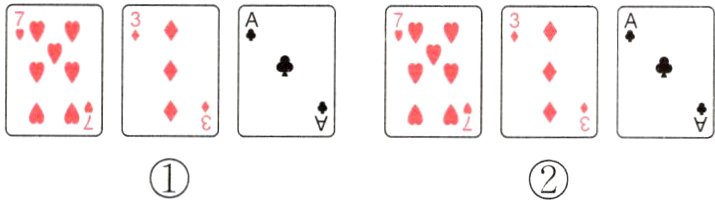 9. 3张扑克牌放在桌面上如图①,小芳把其中一张牌旋转180°后得到图②。小芳旋转的牌从左往右数是第( )张。