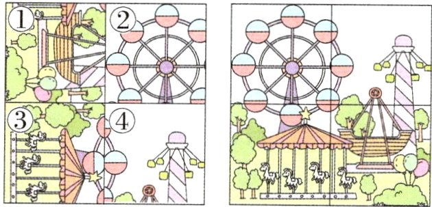 13. 新趋势 开放探究 午饭时间到了,亲子餐厅开展“拼图游戏”活动:如果以最少步骤将下面左边的拼图还原成右侧的样子(平移和旋转),就可以免费赠送一份小礼物,奇奇应该怎样做才能获得礼物?(请把步骤写出来)