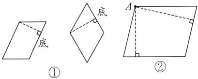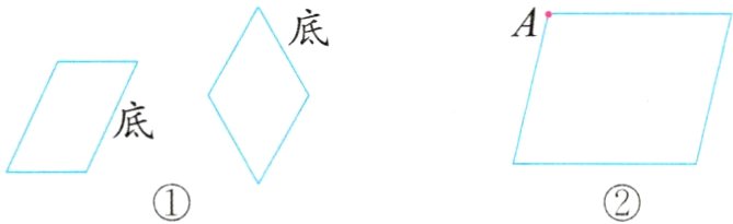 2. 在图①中画出平行四边形指定底边上的高。在图②中过点A分别画出平行四边形的两条高。