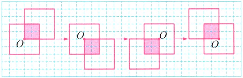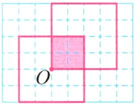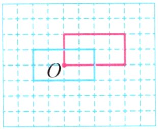 活学活用 如图,红色长方形的顶点与蓝色长方形的中心点O重合,将红色长方形绕点O依次逆时针旋转90°,每次旋转前和旋转后重叠部分形状( ),大小( )。