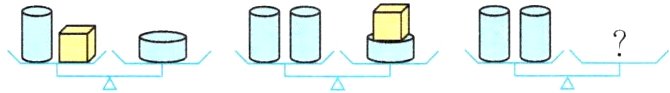 $4$ 解析:在第一个天平左、右两边各放一个正方体,天平仍然平衡。再结合第二个天平可知,一个较高的圆柱的质量等于$2$个正方体的质量。所以第三个天平右边要放$4$个正方体。