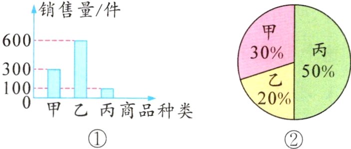 15 解析 根据图①可知甲种商品的销售量为300件,乙种商品的销售量为600件,丙种商品的销售量为100件。根据图②假设总利润为1000元,则甲种商品单件的利润为1000×30%÷300 = 1(元),乙种商品单件的利润为1000×20%÷600 = $\frac{1}{3}$(元),丙种商品单件的利润为1000×50%÷100 = 5(元),因此单件商品的最高利润是最低利润的5÷$\frac{1}{3}$ = 15倍。