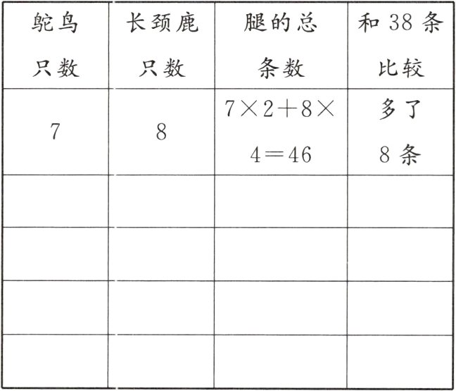 鸵鸟只数 长颈鹿只数 腿的总条数 和38条比较