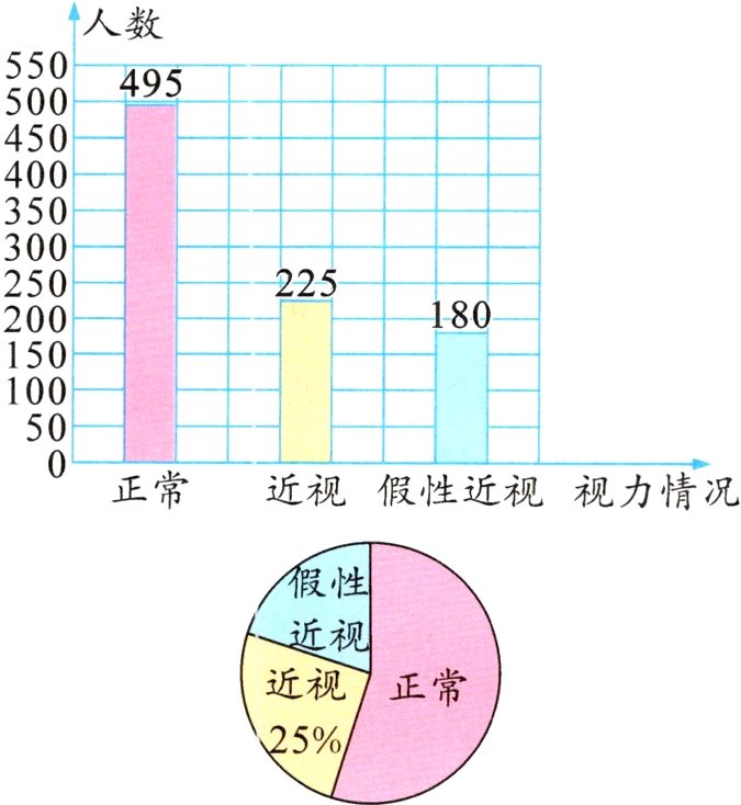 (3)$(225 + 180)\div900 = 45\%$ 该小学的学生视力不良的人数占比为45%,人数较多。建议学校要多提醒学生按时做眼保健操,注意科学用眼。(合理即可)