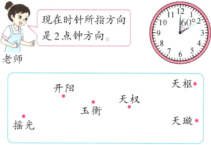 5. 新情境 真实生活 据古籍《鹖冠子》(“鹖”读hé)记载,古人通过观察北斗七星的斗柄所指的方向来确定季节。下面是刘智画的北斗七星示意图,但是他漏画了天玑星,老师说:“天玑星在玉衡星的4点钟方向,天权星在天玑星的11点钟方向。”你能帮他补全吗?