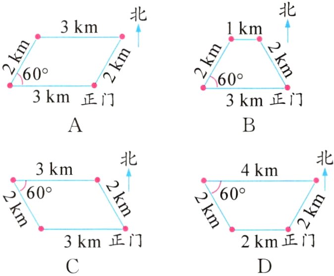 3. 亮点原创 某景点小交通车每次从正门出发,向西行驶3千米后,再向北偏东30°方向行驶2千米,然后再向东行驶3千米,最后向南偏西30°方向行驶,回到正门。小交通车正确的行驶路线图是( )。