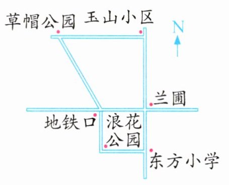 1. 下面是点点所在城市的部分平面图。点点从东方小学去草帽公园,她可以先往西走到( ),再往( )走到( ),再往( )偏( )走到草帽公园;她还可以先往北走到( ),再往( )走到玉山小区,再往( )走到草帽公园。