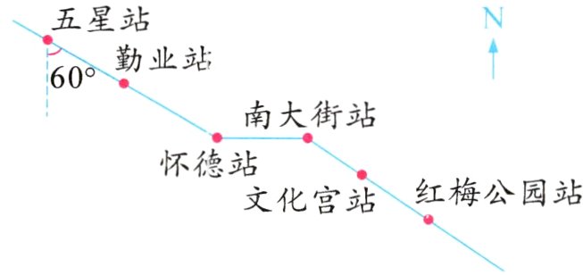 (1)地铁2号线从五星站出发向南大街站行驶的路线:先向( )偏( )( )°方向行驶到( )站,再向东行驶即可到达南大街站。
