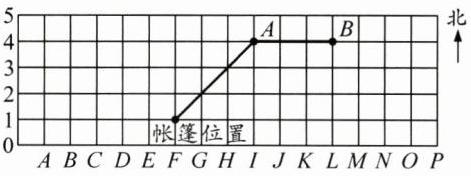 (1)通过实地考察,越野项目是从帐篷的位置出发,向北偏东45°方向跑210米,到一棵大树下插上小红旗,记为点A,请在图中标出点A的位置;再跑到点B(L,4),拍照打卡,请在图中标出点B的位置。最后按原路返回帐篷的位置。(小正方形的边长为1个单位长度,代表实际距离50米,对角线约是1.4个单位长度,代表实际距离70米)