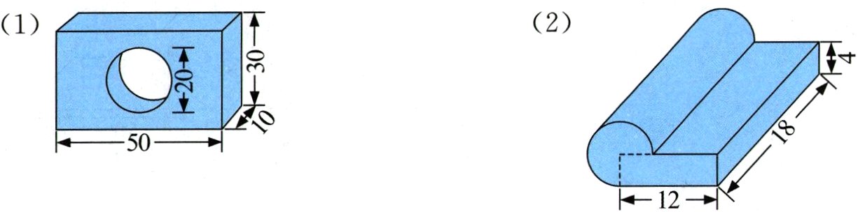 (1)$50×10×30 - 3.14×(20÷2)^2×10 = 11860$(立方厘米) (2)$3.14×4^2×18×\frac{3}{4} + 12×4×18 = 1542.24$(立方厘米)