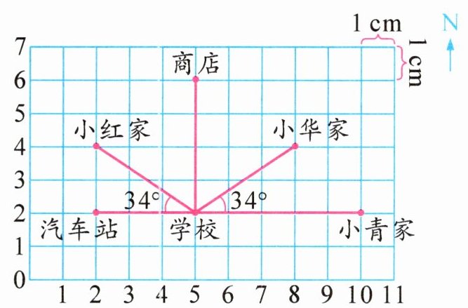 (4) 小红打算去小青家玩,她先沿( )偏( )( )°方向走到学校,再沿学校的( )方向走到小青家。