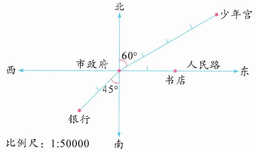 1. 少年宫在市政府的( )偏( )( )°方向( )米处。