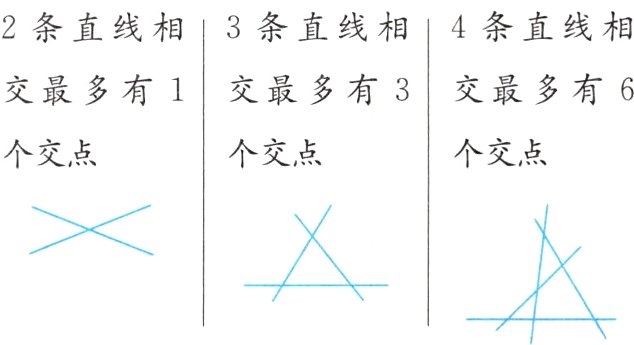 (1)5条直线相交最多有( )个交点,比4条直线相交多( )个交点。