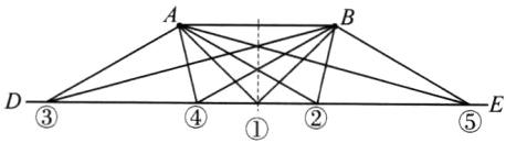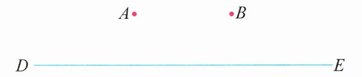 3. 如图,A、B是等腰三角形的两个顶点,三角形还有一个顶点C在直线DE上,符合要求的三角形有( )个,请找出这样的点C,并画出对应的三角形。
