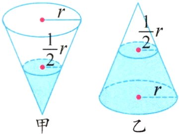 7. 如图,两个相同的圆锥形容器中各装有一些水,水深都是圆锥高的一半,甲、乙两容器中哪一个的水多?多的容器中的水是少的水的几倍?