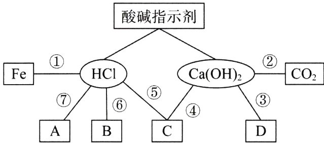 13. 在学习酸碱的化学性质时常构建思维导图梳理知识(如下页图)。A、B、C、D是不同类别的化合物,“——”表示两种物质在一定条件下可以发生化学反应。请回答下列问题。