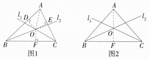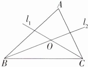 ∵∠ACB、∠ABC的平分线$l_1$、$l_2$相交于点O,