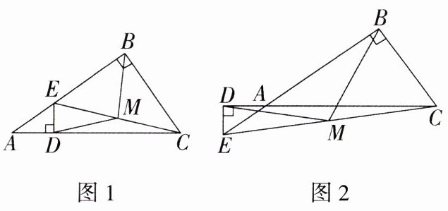 22.(12分)已知在△ABC中,∠ABC = 90°,点E在直线AB上,ED与直线AC垂直,垂足为D,且M为EC的中点,连接BM,DM.
