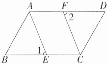 在 $\triangle ABE$ 和 $\triangle CDF$ 中,$\begin{cases}\angle 1=\angle 2,\\\angle B=\angle D,\\AB = CD,\end{cases}$