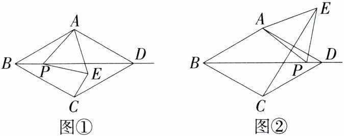 (2)如图②,当点P在线段BD上,且点E在菱形ABCD外部时,(1)中的结论是否还成立?若成立,请予以证明;若不成立,请说明理由.