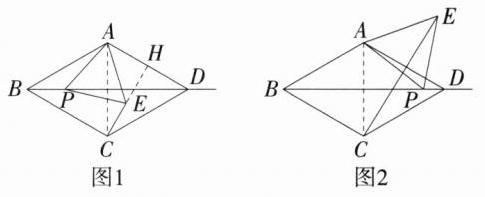 12.[推理能力]在菱形ABCD中,∠ABC = 60°,P是直线BD上一动点,以AP为边向右侧作等边△APE(A,P,E按逆时针排列),点E的位置随动点P的位置变化而变化.