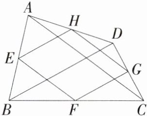 ∴ $EF$ 是 $\triangle ABC$ 的中位线,$HG$ 是 $\triangle ACD$ 的中位线,$EH$ 是 $\triangle ABD$ 的中位线,$FG$ 是 $\triangle BCD$ 的中位线,
