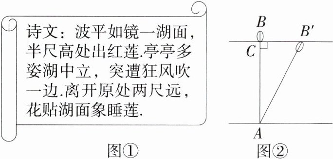 3. 跨语文·古算诗(2024吉林中考)图①中有一首古算诗,根据诗中的描述可以计算出红莲所在位置的湖水深度,其示意图如图②,其中$AB = AB'$,$AB\perp B'C$于点$C$,$BC = 0.5$尺,$B'C = 2$尺. 设$AC$的长度为$x$尺,可列方程为__________.(M8201003)