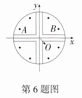6.(2024贵州贵阳二十八中二模)某小区的圆形花园中间有两条互相垂直的小路,园丁在花园中栽种了8棵桂花树,如图所示.若$A,B$两处桂花树的位置关于小路对称,在分别以两条小路所在直线为$x$轴,$y$轴的平面直角坐标系内,点$A$的坐标为$(-6,2)$,则点$B$的坐标为________.