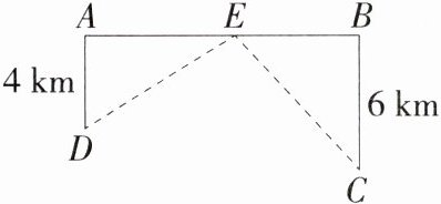 在 $Rt\triangle BCE$ 中,$CE^{2}=BC^{2}+BE^{2}=6^{2}+x^{2}$,由题意可知 $DE = CE$,$\therefore 6^{2}+x^{2}=4^{2}+(10 - x)^{2}$,解得 $x = 4$,$\therefore BE = 4\ km$,$\therefore EA = 10 - 4 = 6(km)$.