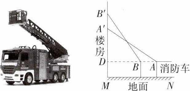 8.(2024湖南娄底期中改编,22,★★☆)如图,已知云梯最多只能伸长到50米(即$AA' = BB' = 50$米),消防车高3.4米,救人时云梯伸长至最长,在从33.4米(即$A'M = 33.4$米)高的$A$处救完人后,还要从51.4米(即$B'M = 51.4$米)高的$B$处救人,这时消防车从$A$处向着火的楼房靠近的距离$AB$为________米.
